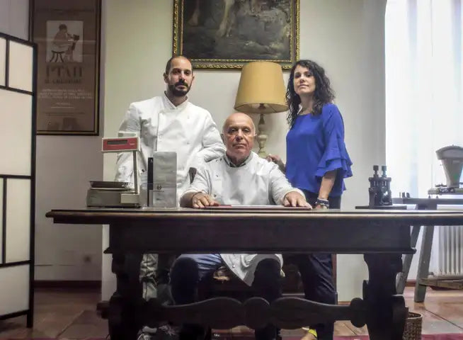 Emanuele ha aperto il laboratorio in Via Drapperie nel 1975. Oggi ci lavorano anche i figli: Francesco progetta i gioielli in 3D, Giorgia gestisce la gioielleria e segue i clienti. Chi entra li vede al lavoro.